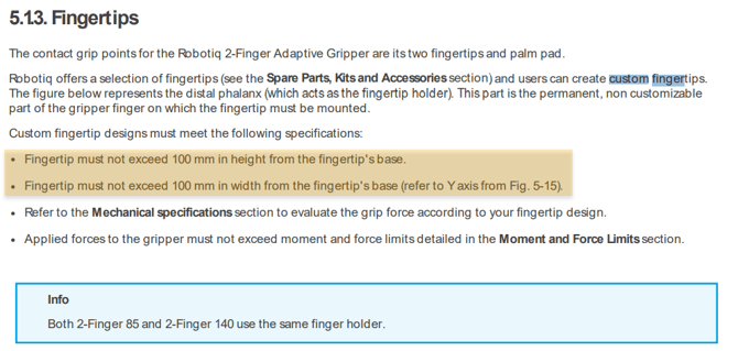Specifications and limitations for designing custom fingertips for Hand‑E and 2F grippers