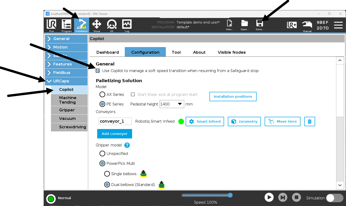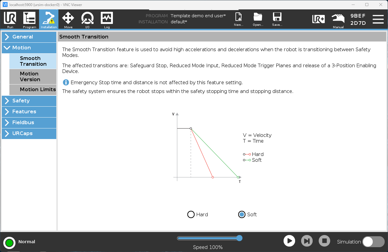 Disabling Copilot’s safeguard stop soft speed transition management allows EtherNet/IP to fully control the system without interference. If a soft transition is required, similar behavior can be configured directly in the Universal Robots safety settings.
