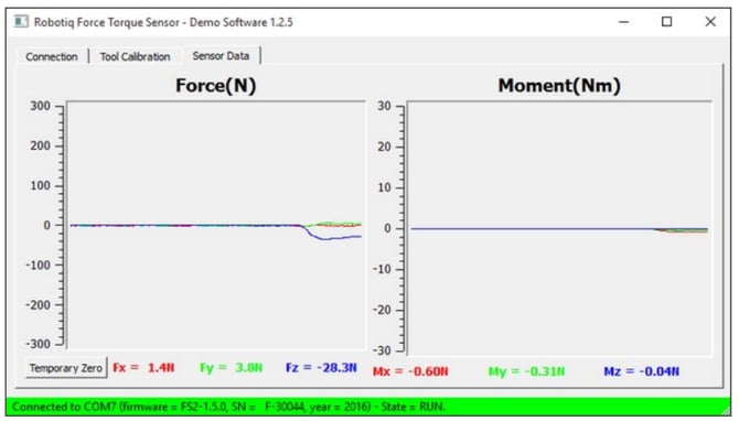 By going into the Sensor Data tab, you can now see in real time the force and moment applied on the FT Sensor.