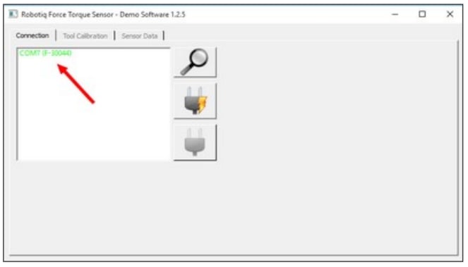 - You should see a COM port in green with a serial number, showing the Sensor connected to the PC. Click on it.