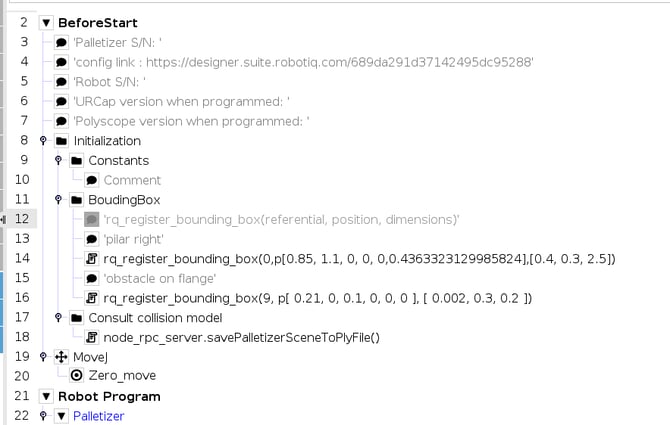 Bounding boxes are used in Robotiq’s Palletizing Solution to define collision areas for debugging and validation. The online configurator provides an efficient way to design these boxes, export them as JSON, and integrate them into your robot program. The function rq_register_bounding_box() is then used to register them in the application.