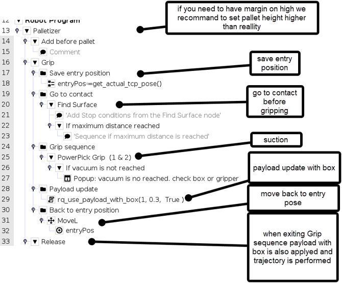 By combining a fixed entry pose, contact detection, and Z offset, you create a flexible yet reliable depalletization program. The only tradeoff is ensuring that the entry pose itself is feasible from all approach directions. Using bounding boxes and slight height margins can solve most cases.