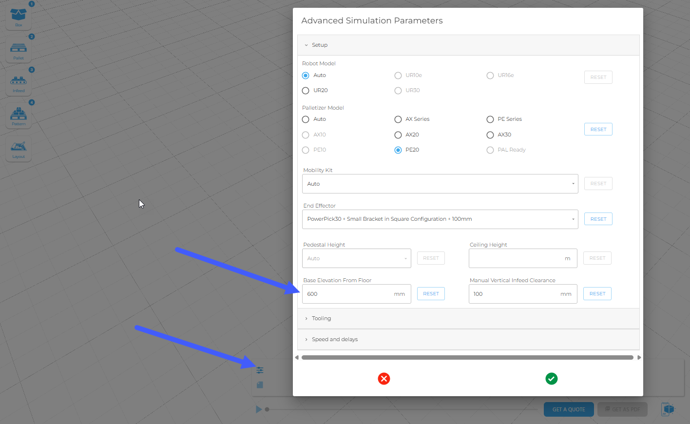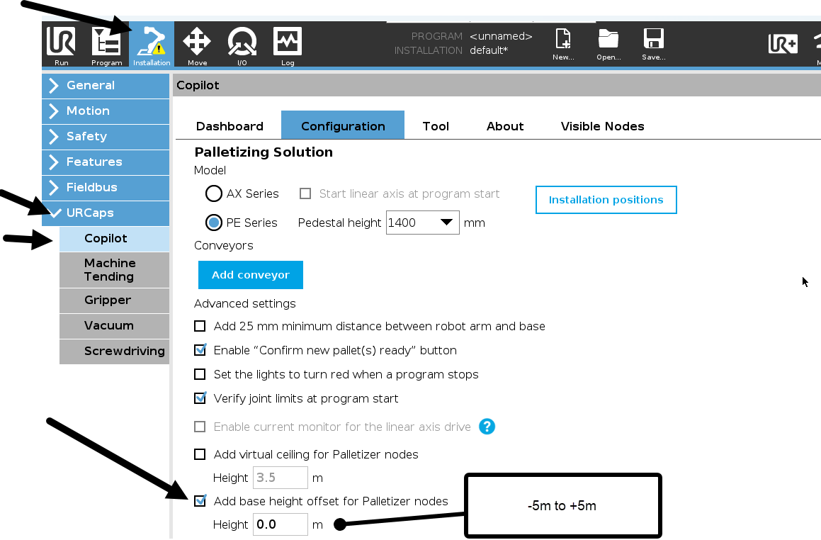 Raising the palletizer height can be done either via pedestal extension or base sur-elevation. Since Robotiq does not offer custom taller pedestals, the recommended and proven method is to sur-elevate the base using structural beams. Always validate reach using the Configurator and consult Robotiq for support with simulations.