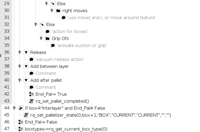 - If the box is an interlayer, skip the normal palletizing node to avoid applying the default trajectory thanks to script command :