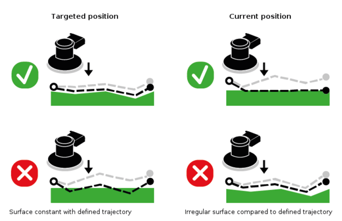 - Targeted Position: Adjusts based on the detected forces and the initially taught trajectory. It considers the shape of the trajectory and adjusts accordingly. This mode is recommended for irregular surfaces.