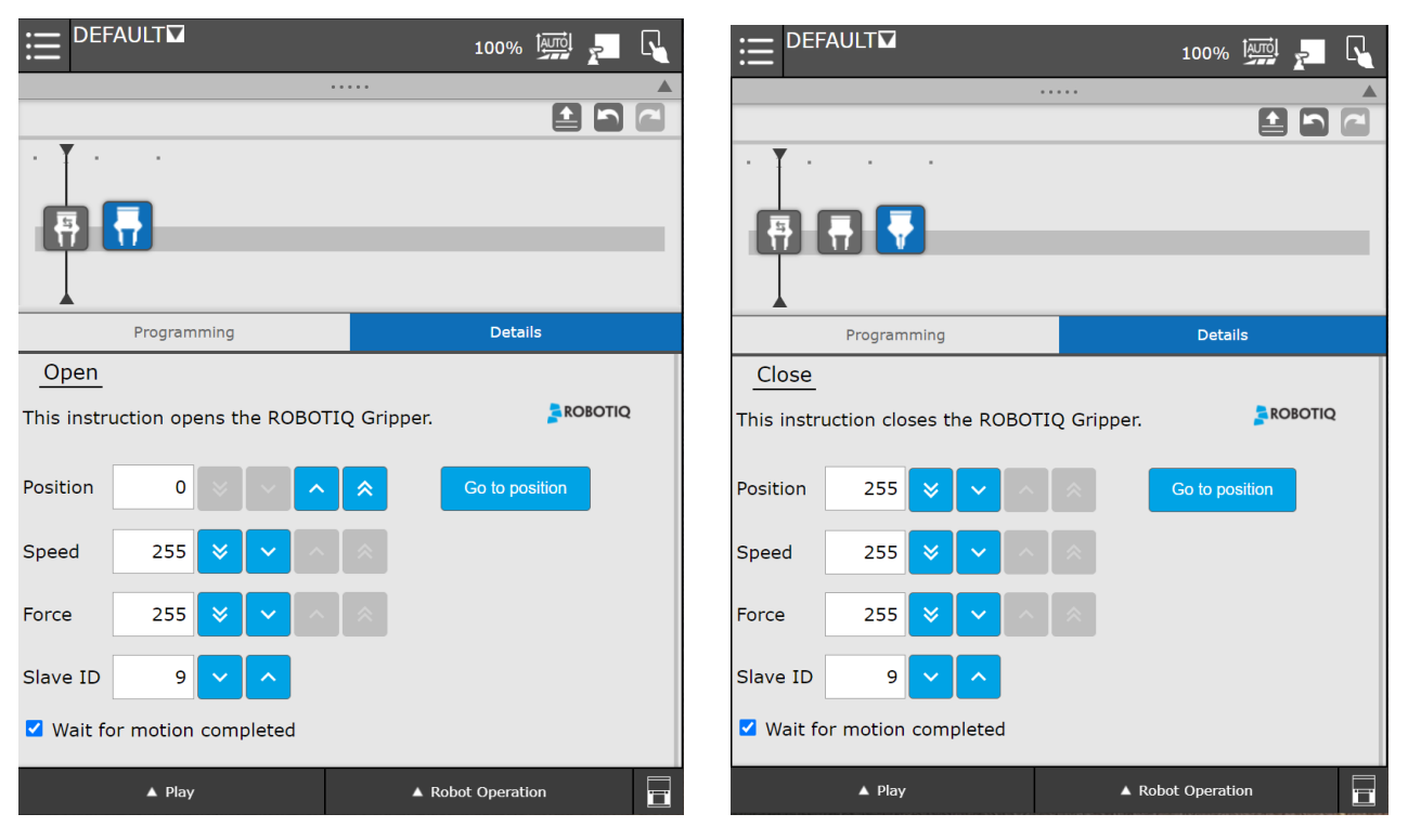 - Ensure a ROBOTIQ Activate instruction is placed before any open/close instruction.